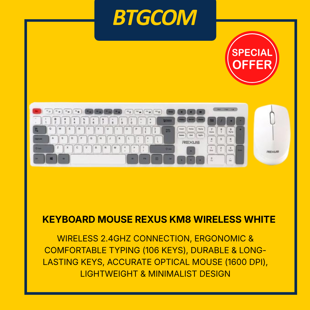 Keyboard Rexus KM8 dilengkapi 106 tombol yang didesain secara ergonomis dengan bentuk keycaps yang cekung sesuai bentuk ujung jari sehingga nyaman digunakan saat mengetik