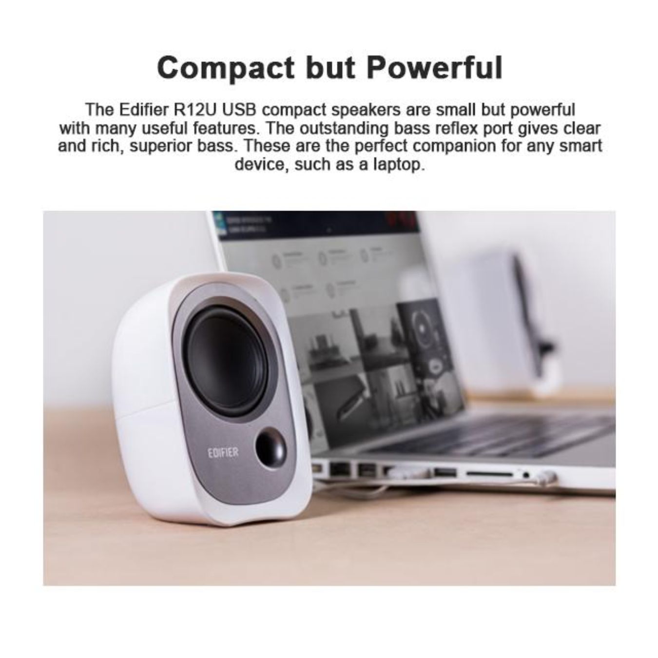 The Edifier R12U USB compact speakers are small but powerful with many useful features. The outstanding bass reflex port gives clear and rich, superior bass. These are the perfect companion for any smart device, such as a laptop.