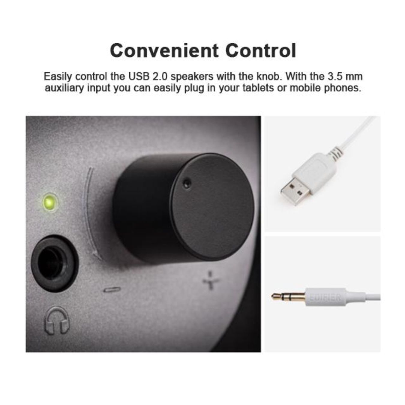 Easily control the USB 2.0 speakers with the knob. With the 3.5 mm auxiliary input you can easily plug in your tablets or mobile phones